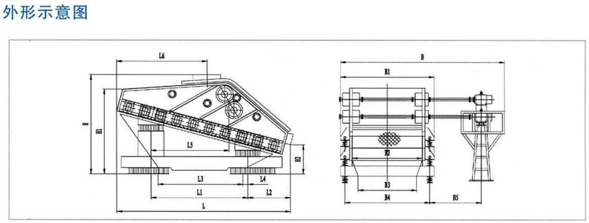 該系列振動(dòng)篩由篩箱、激振器、支承彈簧、隔振架、二次隔振彈簧、電動(dòng)機(jī)及其支架等組成。